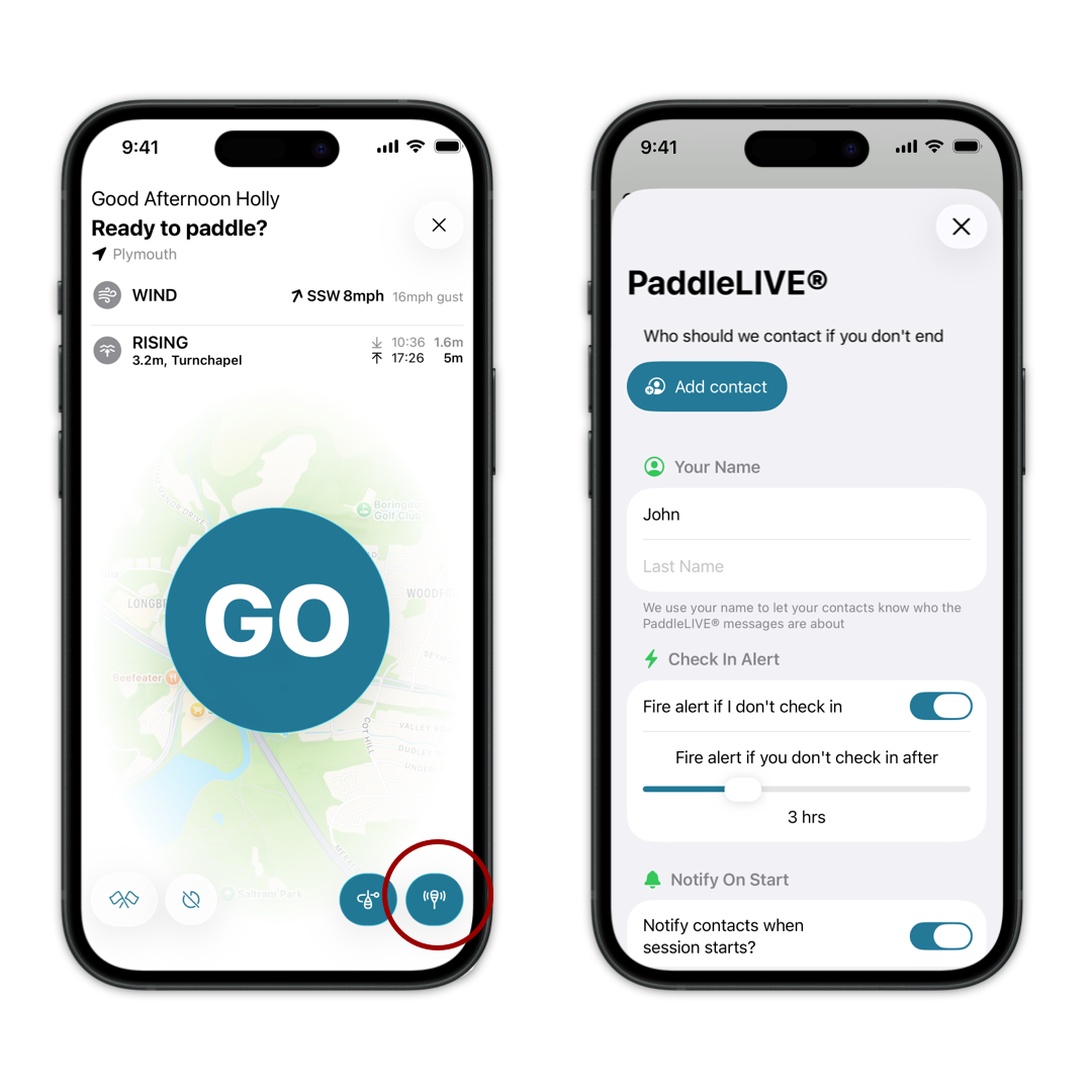If you're on iPhone, tap PaddleLIVE® at the bottom right of the main GO screen. From here you'll need to fill in the required fields, add your emergency contact/s and set your minimum session duration and extension preferences. For additional safety, we recommend having at least two emergency contacts.