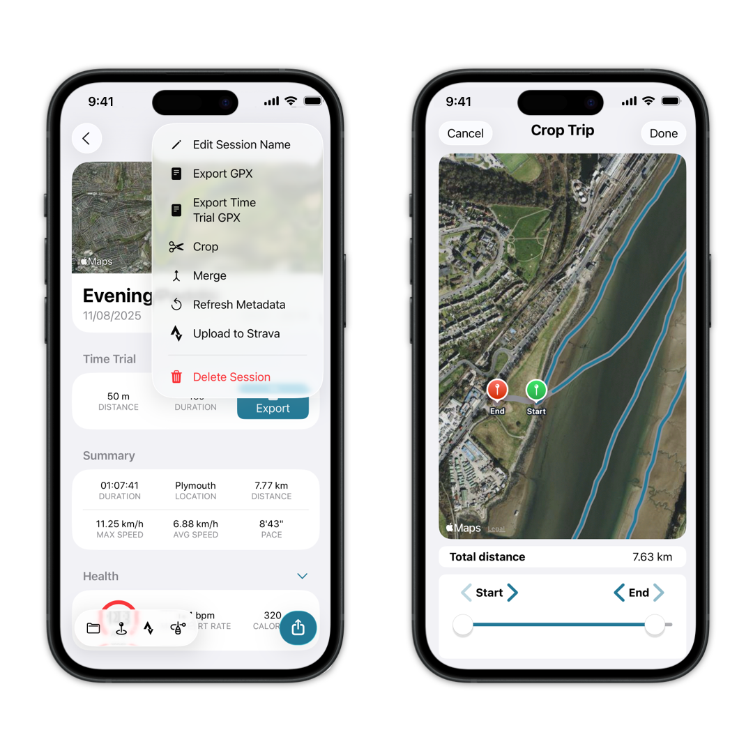 Please note: cropping your session is irreversible. If you may want to revert back to the original session details, we recommend exporting a GPX of the original first so that you can manually import this original back into the app if you make a mistake.