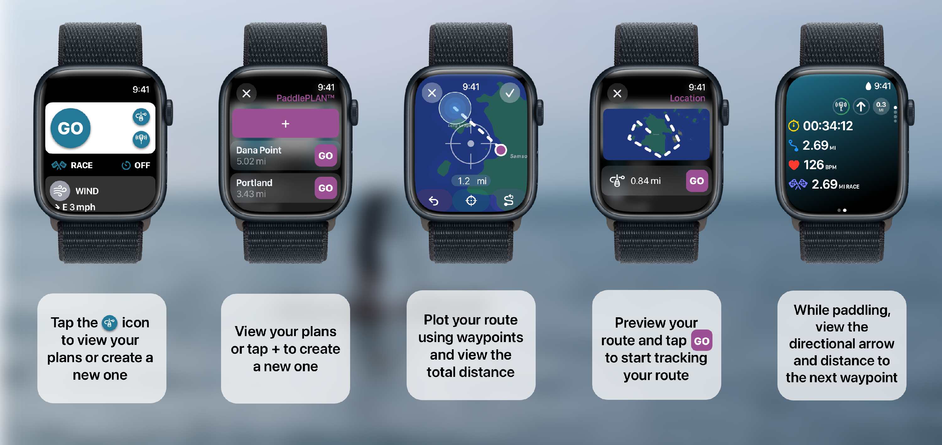 - To plot your route on iPhone, tap PaddlePLAN®, then the + icon and set your waypoints. Once you're happy with your route and the calculated distance tap Save. Once you're ready to go, tap the ... next to the plan, and Send to Watch. You'll then be able to tap the PaddlePLAN® icon on your Apple Watch and find the route under the list of Your Plans. Hit GO to begin tracking.