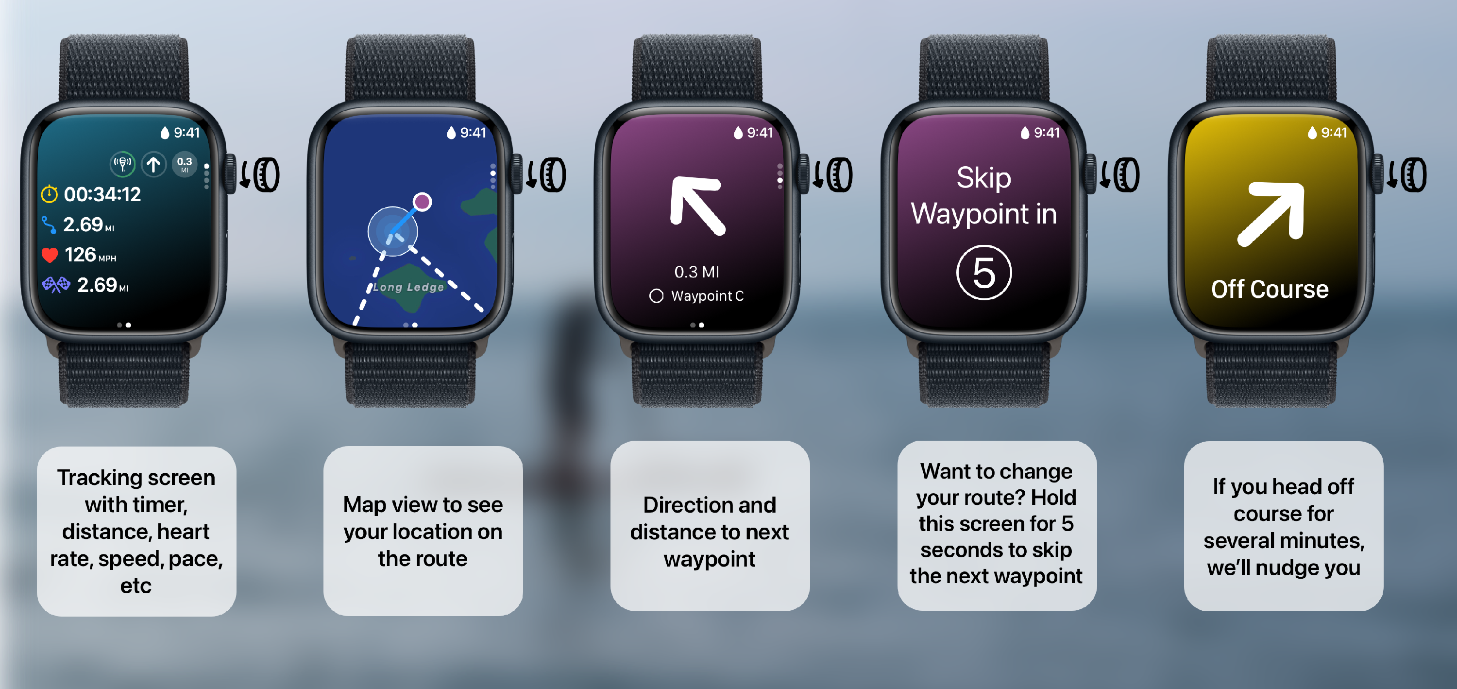 If you head in a direction more than 90 degrees away from your next waypoint, for more than 3 minutes, we'll nudge you to head back towards the waypoint with haptic feedback (Apple Watch vibration). You'll see a big arrow on the screen of your watch showing you the way, but don't forget you can still scroll using the crown to either view your other stats, view the map or skip the waypoint.
