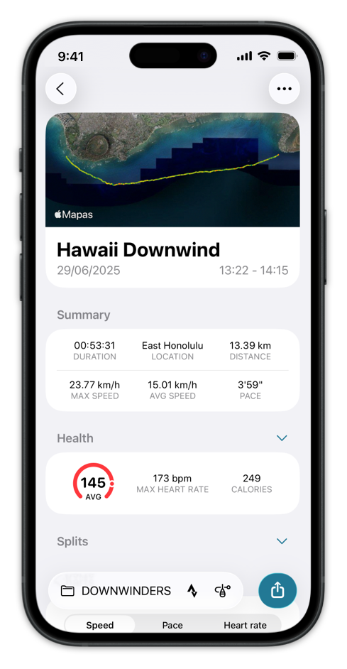 Tapping the sharing icon (it's in the same section as the folder name) will generate a branded route map JPEG that you can save to the iPhone's native Photos app or send directly to your friends and/or social apps via the iOS share card.